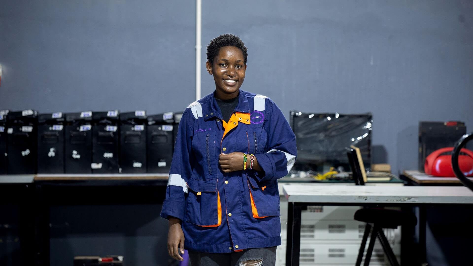 Linnet Kusiima, one of the young women working GOGO Electric’s battery department. GOGO contributes to the skilling and employability of managers, technicians and motorcycle operators in the Ugandan e-mobility sector, fostering a green transition in the transport industry.